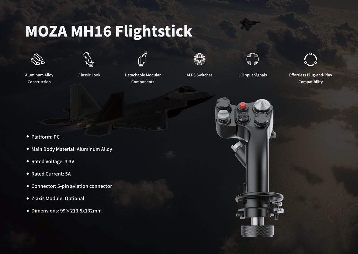 The MOZA MH16 Flightstick, made of aircraft-grade aluminum alloy with automotive-grade paint, offers exceptional durability and a classic fighter jet design. It features detachable modular components with pogo pin connections for easy installation and stable operation, providing additional switches without tangled cables. With 27 input signals and an 8-way ALPS joystick, the MH16 allows for extensive customization via MOZA cockpit control software. Its plug-and-play compatibility ensures it fits perfectly with most bases, offering a realistic and reliable flight experience.
