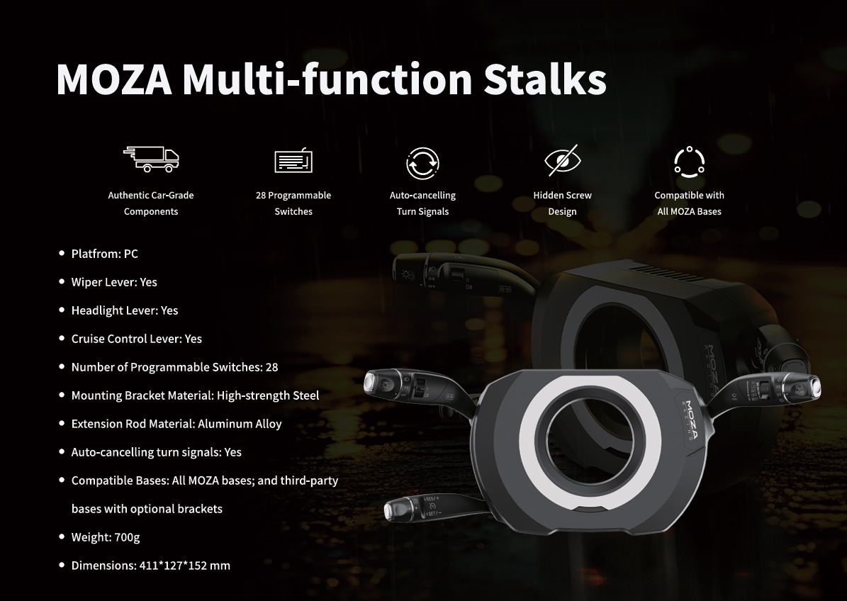 Los Stalks Multifuncionales MOZA son compatibles con todas las bases MOZA, desde R3 hasta R21. Incluyen soportes y varillas de extensión para una instalación fácil, soportando tanto montajes estándar como invertidos. Los stalks se pueden montar directamente en bases con agujeros de montaje frontal y ajustarse para mayor comodidad ergonómica. También se conectan directamente a un PC y, con los soportes adecuados, son compatibles con bases de ruedas de terceros.