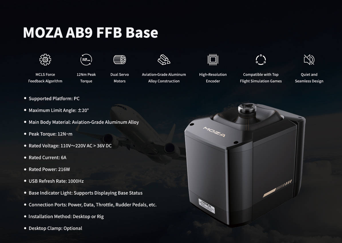 El MOZA AB9 Base está equipado con motores duales servo que ofrecen un par máximo de 12Nm, proporcionando retroalimentación precisa y dinámica que simula diversas condiciones de vuelo como rodaje, despegue, aterrizaje y turbulencia. Presenta nuestra tecnología exclusiva MCLS Force Feedback y un codificador de alta resolución, ofreciendo una experiencia de vuelo excepcionalmente precisa e inmersiva. Fabricado en aleación de aluminio de grado aeronáutico con un diseño silencioso y sin ventilador, garantiza durabilidad y operación sin interrupciones. El software de control de cabina MOZA permite una personalización exhaustiva y ajustes precisos. Compatible con los principales juegos de simulación de vuelo y soportando joysticks de vuelo de terceros, el AB9 Base está diseñado para ofrecer versatilidad y fiabilidad, siendo ideal para entusiastas y entrenadores profesionales.